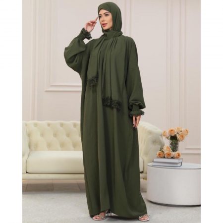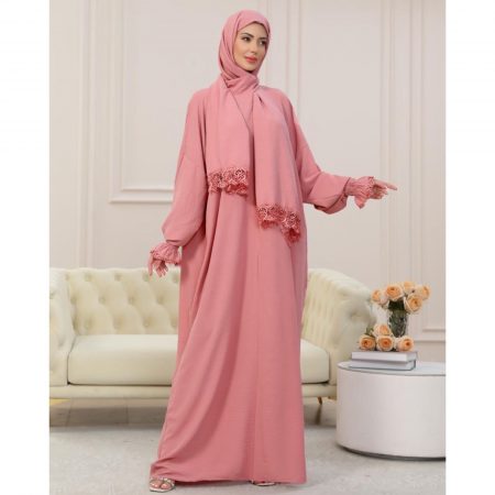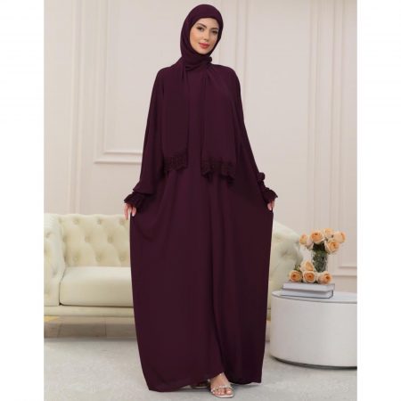 A one-piece Islamic prayer with a seamless hijab attachment, a flowing, full-coverage design, delicate lace accents, and lightweight, breathable fabric.
