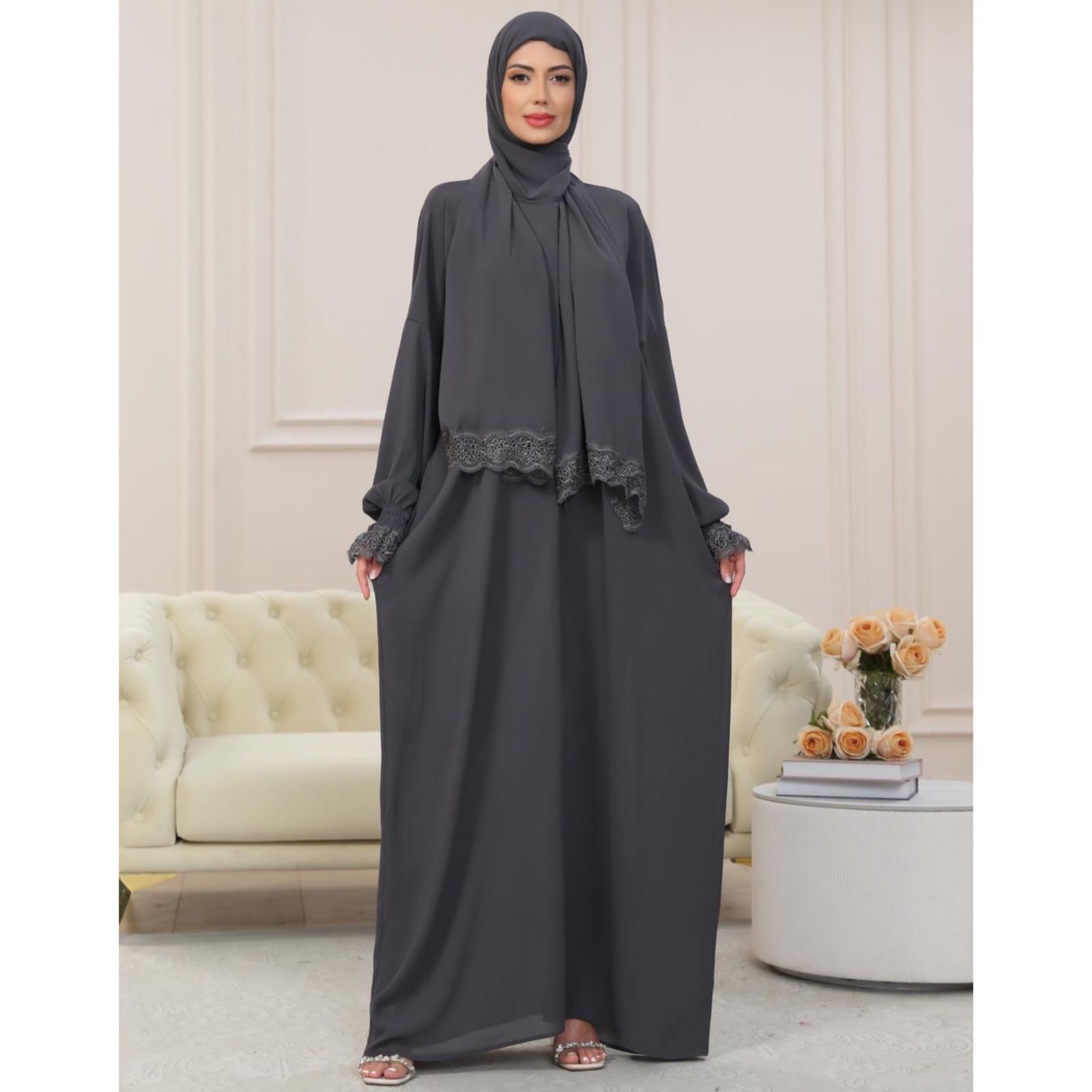 Our dresses offer a loose, flowing silhouette to ensure full coverage, while delicate lace accents on the sleeve cuffs and hijab edges add a touch of sophistication. Made from high-quality, lightweight polyester, this dress is breathable, wrinkle-resistant, and soft on the skin, offering all-day comfort for prayers and gatherings. Available in 10 stunning colours, from neutral tones to vibrant shades, this versatile and stylish prayer dress is perfect for daily wear, mosque visits, and religious occasions.