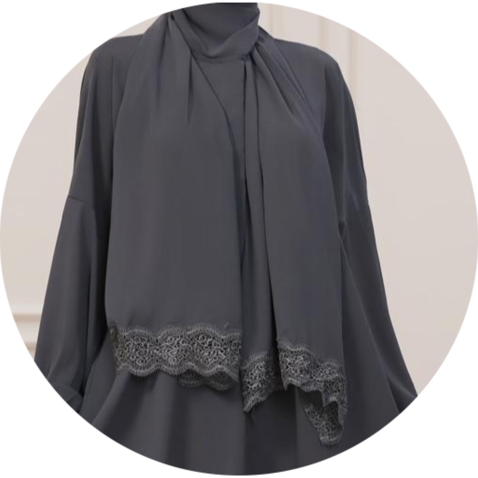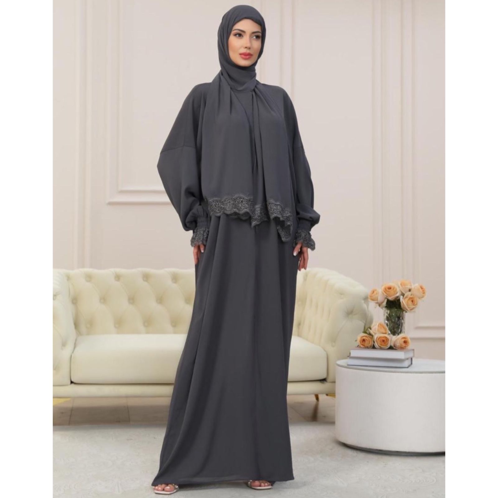 A one-piece Islamic prayer with a seamless hijab attachment, a flowing, full-coverage design, delicate lace accents, and lightweight, breathable fabric.